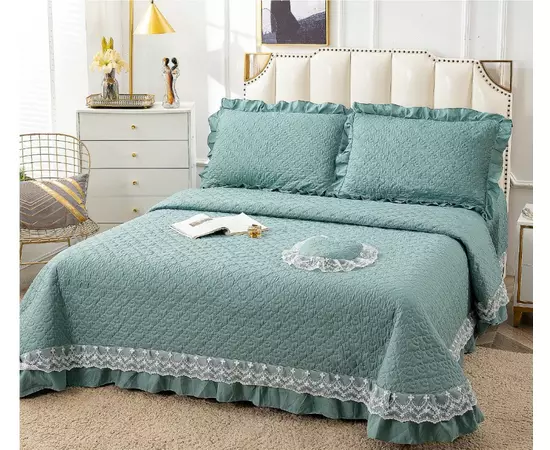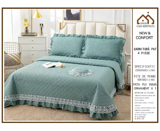 Cuvertura de pat matlasata, confectionata din bumbac tip tesatura finet.Imprimeul acestui set (cuvertura pat plus fete de perna) este realizat cu cele mai noi tehnologii - garantat nu se decoloreaza daca se respecta instructiunile de intretinere.