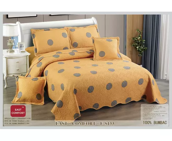 Cuvertura Pat din Bumbac este compusa din 5 piese si este realizata din bumbac 100%. Cuvertura de pat este rezistenta la spalari repetate. Pernele decorative creaza senzatia de confort si relaxare. Decoreaza dormitorul cu eleganta cuverturei de pat din bumbac.