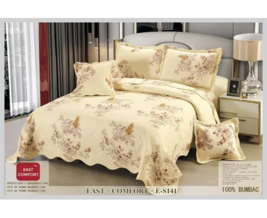 Cuvertura Pat din Bumbac este compusa din 5 piese si este realizata din bumbac 100%. Cuvertura de pat este rezistenta la spalari repetate. Pernele decorative creaza senzatia de confort si relaxare. Decoreaza dormitorul cu eleganta cuverturei de pat din bumbac.