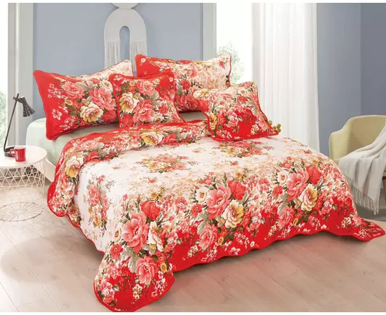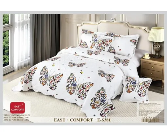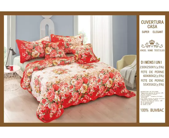 Cuvertura Pat din Bumbac este compusa din 5 piese si este realizata din bumbac 100%. Cuvertura de pat este rezistenta la spalari repetate. Pernele decorative creaza senzatia de confort si relaxare. Decoreaza dormitorul cu eleganta cuverturei de pat din bumbac.