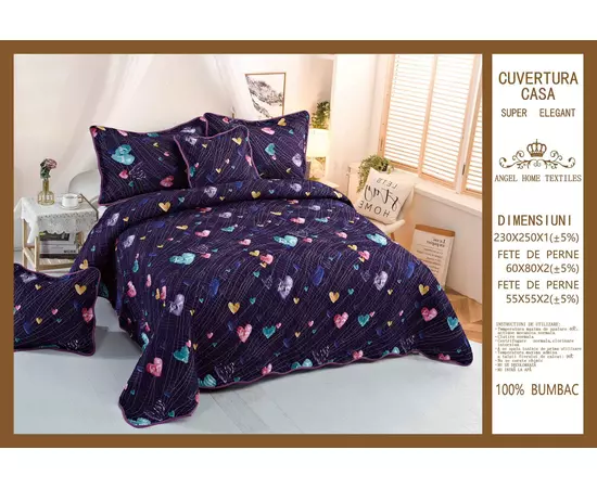 Cuvertura Pat din Bumbac este compusa din 5 piese si este realizata din bumbac 100%. Cuvertura de pat este rezistenta la spalari repetate. Pernele decorative creaza senzatia de confort si relaxare. Decoreaza dormitorul cu eleganta cuverturei de pat din bumbac.