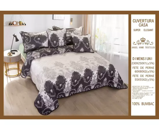 Cuvertura Pat din Bumbac este compusa din 5 piese si este realizata din bumbac 100%. Cuvertura de pat este rezistenta la spalari repetate. Pernele decorative creaza senzatia de confort si relaxare. Decoreaza dormitorul cu eleganta cuverturei de pat din bumbac.
