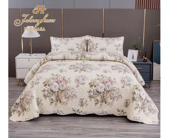 Cuvertura Pat din Bumbac este compusa din 4 piese si este realizata din bumbac 100%. Cuvertura de pat este rezistenta la spalari repetate. Pernele decorative creaza senzatia de confort si relaxare. Decoreaza dormitorul cu eleganta cuverturei de pat din bumbac.