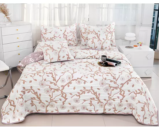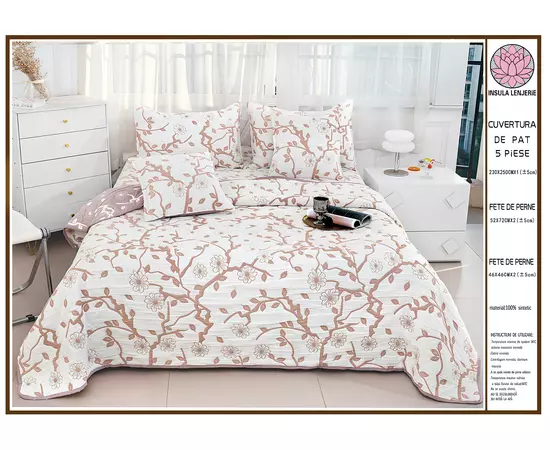 Cuvertura de pat matlasata, confectionata din bumbac tip tesatura finet.Imprimeul acestui set (cuvertura pat plus fete de perna) este realizat cu cele mai noi tehnologii - garantat nu se decoloreaza daca se respecta instructiunile de intretinere.