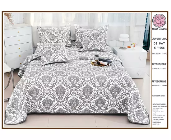 Cuvertura de pat matlasata, confectionata din bumbac tip tesatura finet.Imprimeul acestui set (cuvertura pat plus fete de perna) este realizat cu cele mai noi tehnologii - garantat nu se decoloreaza daca se respecta instructiunile de intretinere.