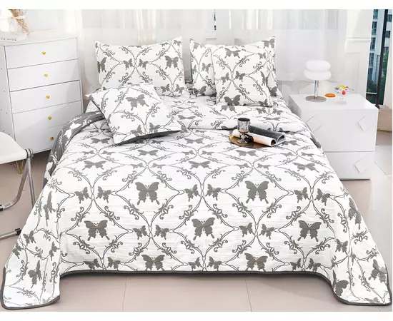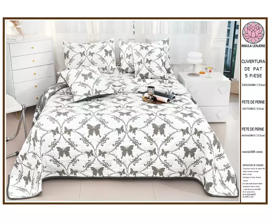 Cuvertura de pat matlasata, confectionata din bumbac tip tesatura finet.Imprimeul acestui set (cuvertura pat plus fete de perna) este realizat cu cele mai noi tehnologii - garantat nu se decoloreaza daca se respecta instructiunile de intretinere.