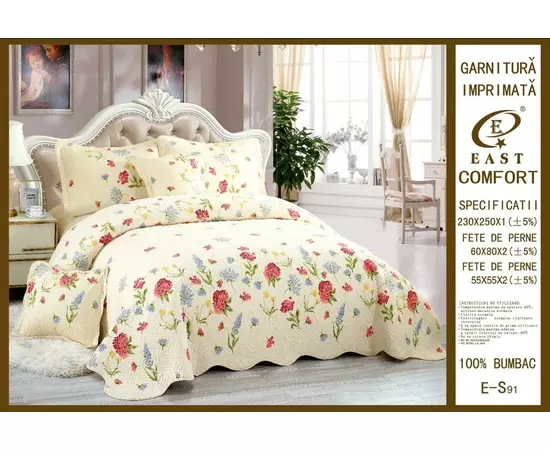 Cuvertura Pat din Bumbac este compusa din 5 piese si este realizata din bumbac 100%. Cuvertura de pat este rezistenta la spalari repetate. Pernele decorative creaza senzatia de confort si relaxare. Decoreaza dormitorul cu eleganta cuverturei de pat din bumbac.