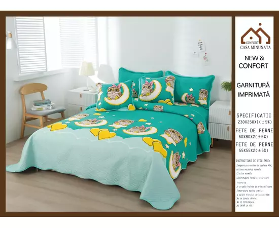 Cuvertura Pat din Bumbac este compusa din 5 piese si este realizata din bumbac 100%. Cuvertura de pat este rezistenta la spalari repetate. Pernele decorative creaza senzatia de confort si relaxare. Decoreaza dormitorul cu eleganta cuverturei de pat din bumbac.