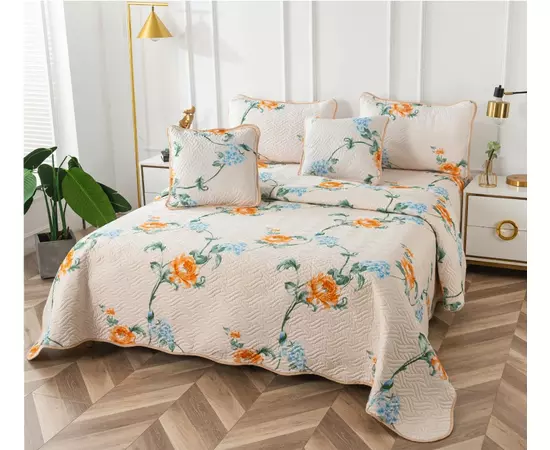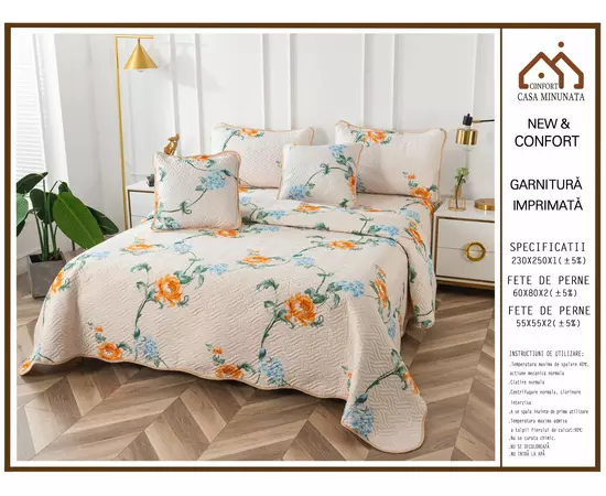 Cuvertura Pat din Bumbac este compusa din 5 piese si este realizata din bumbac 100%. Cuvertura de pat este rezistenta la spalari repetate. Pernele decorative creaza senzatia de confort si relaxare. Decoreaza dormitorul cu eleganta cuverturei de pat din bumbac.