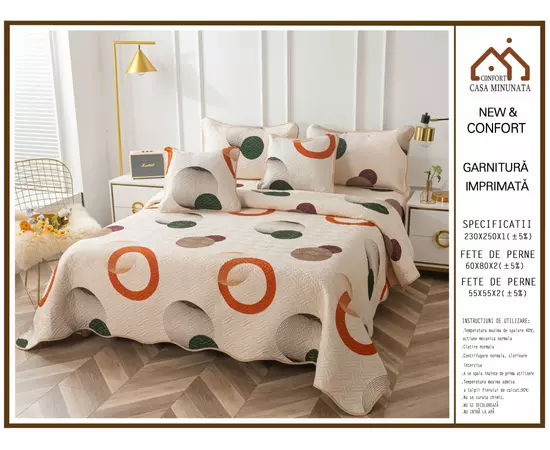 Cuvertura Pat din Bumbac este compusa din 5 piese si este realizata din bumbac 100%. Cuvertura de pat este rezistenta la spalari repetate. Pernele decorative creaza senzatia de confort si relaxare. Decoreaza dormitorul cu eleganta cuverturei de pat din bumbac.