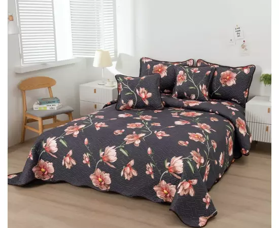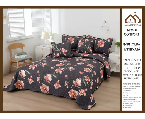 Cuvertura Pat din Bumbac este compusa din 5 piese si este realizata din bumbac 100%. Cuvertura de pat este rezistenta la spalari repetate. Pernele decorative creaza senzatia de confort si relaxare. Decoreaza dormitorul cu eleganta cuverturei de pat din bumbac.
