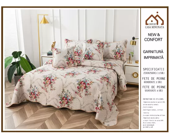 Cuvertura Pat din Bumbac este compusa din 5 piese si este realizata din bumbac 100%. Cuvertura de pat este rezistenta la spalari repetate. Pernele decorative creaza senzatia de confort si relaxare. Decoreaza dormitorul cu eleganta cuverturei de pat din bumbac.