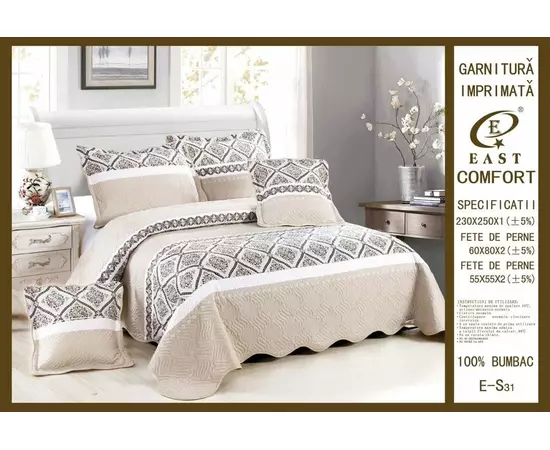 Cuvertura de pat matlasata, confectionata din bumbac tip tesatura finet.Imprimeul acestui set (cuvertura pat plus fete de perna) este realizat cu cele mai noi tehnologii - garantat nu se decoloreaza daca se respecta instructiunile de intretinere.