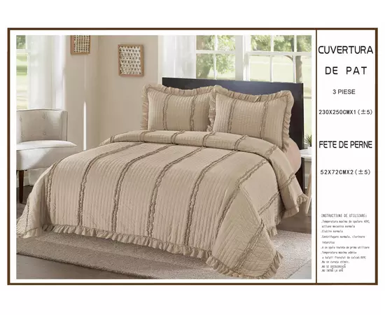Cuvertura de pat matlasata, confectionata din bumbac tip tesatura finet.Imprimeul acestui set (cuvertura pat plus fete de perna) este realizat cu cele mai noi tehnologii - garantat nu se decoloreaza daca se respecta instructiunile de intretinere.