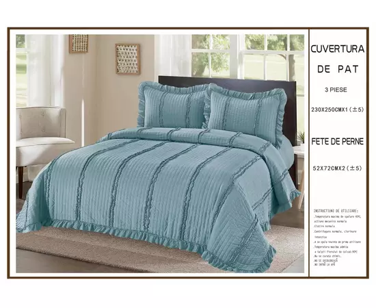 Cuvertura de pat matlasata, confectionata din bumbac tip tesatura finet.Imprimeul acestui set (cuvertura pat plus fete de perna) este realizat cu cele mai noi tehnologii - garantat nu se decoloreaza daca se respecta instructiunile de intretinere.