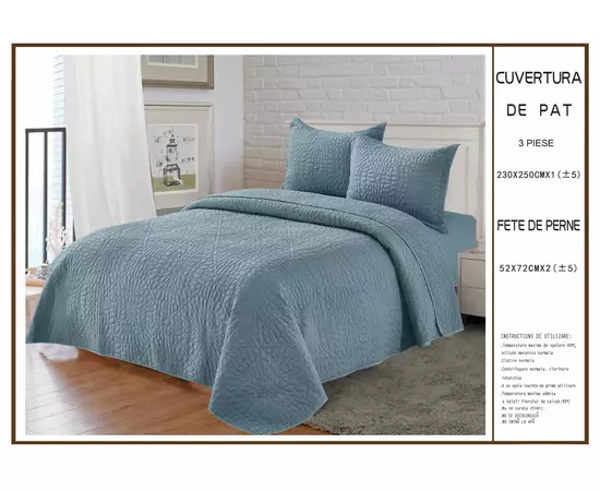 Cuvertura de pat matlasata, confectionata din bumbac tip tesatura finet.Imprimeul acestui set (cuvertura pat plus fete de perna) este realizat cu cele mai noi tehnologii - garantat nu se decoloreaza daca se respecta instructiunile de intretinere.