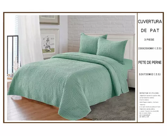 Cuvertura de pat matlasata, confectionata din bumbac tip tesatura finet.Imprimeul acestui set (cuvertura pat plus fete de perna) este realizat cu cele mai noi tehnologii - garantat nu se decoloreaza daca se respecta instructiunile de intretinere.