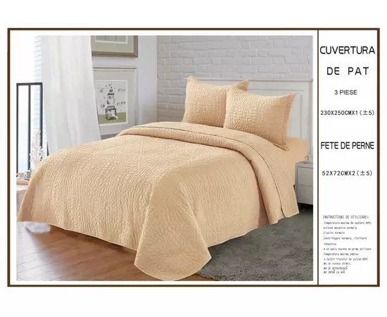 Cuvertura de pat matlasata, confectionata din bumbac tip tesatura finet.Imprimeul acestui set (cuvertura pat plus fete de perna) este realizat cu cele mai noi tehnologii - garantat nu se decoloreaza daca se respecta instructiunile de intretinere.