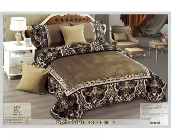 Setul cu cuvertură pentru pat din catifea este o alegere elegantă și luxoasă pentru orice dormitor. Acest set include o cuvertură moale și matasoasă din catifea, care adaugă o notă de rafinament și confort suprem în camera ta. Catifeaua este cunoscută pentru textura sa fină și aspectul său strălucitor, ceea ce face ca acest set de cuvertură să fie atât de atractiv vizual.