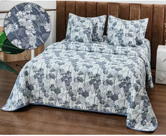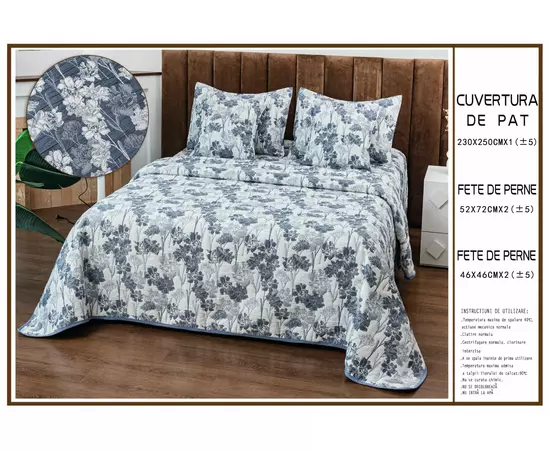 Cuvertura de pat matlasata, confectionata din bumbac tip tesatura finet.Imprimeul acestui set (cuvertura pat plus fete de perna) este realizat cu cele mai noi tehnologii - garantat nu se decoloreaza daca se respecta instructiunile de intretinere.