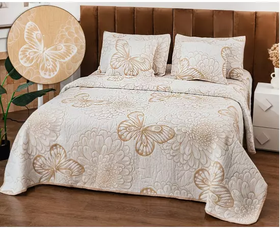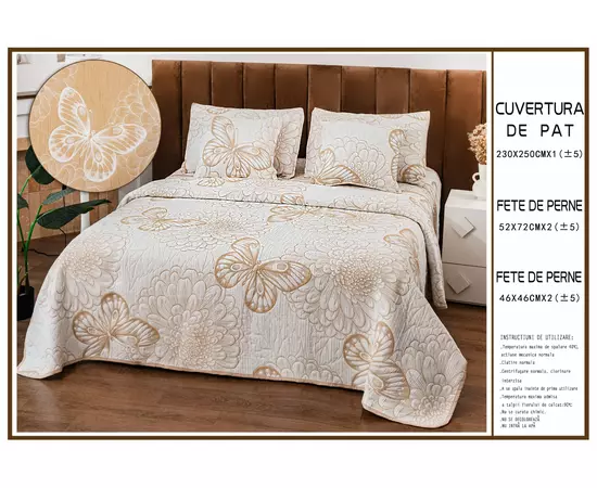 Cuvertura de pat matlasata, confectionata din bumbac tip tesatura finet.Imprimeul acestui set (cuvertura pat plus fete de perna) este realizat cu cele mai noi tehnologii - garantat nu se decoloreaza daca se respecta instructiunile de intretinere.