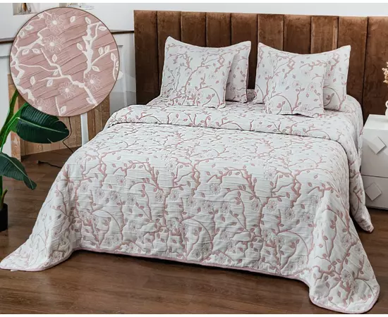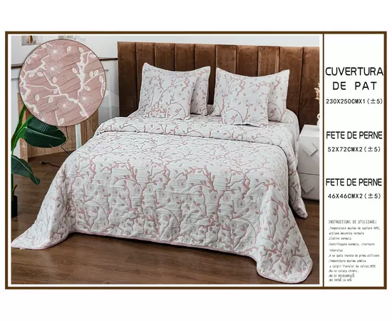 Cuvertura de pat matlasata, confectionata din bumbac tip tesatura finet.Imprimeul acestui set (cuvertura pat plus fete de perna) este realizat cu cele mai noi tehnologii - garantat nu se decoloreaza daca se respecta instructiunile de intretinere.