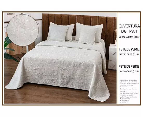 Cuvertura de pat matlasata, confectionata din bumbac tip tesatura finet.Imprimeul acestui set (cuvertura pat plus fete de perna) este realizat cu cele mai noi tehnologii - garantat nu se decoloreaza daca se respecta instructiunile de intretinere.