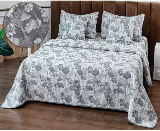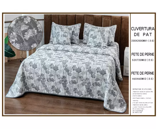 Cuvertura de pat matlasata, confectionata din bumbac tip tesatura finet.Imprimeul acestui set (cuvertura pat plus fete de perna) este realizat cu cele mai noi tehnologii - garantat nu se decoloreaza daca se respecta instructiunile de intretinere.