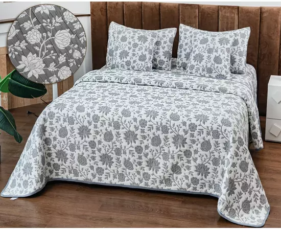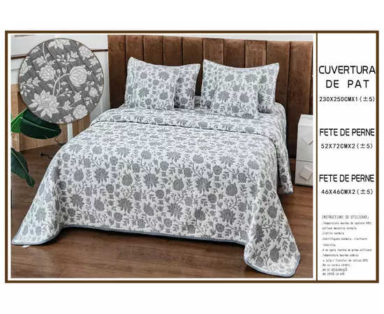 Cuvertura de pat matlasata, confectionata din bumbac tip tesatura finet.Imprimeul acestui set (cuvertura pat plus fete de perna) este realizat cu cele mai noi tehnologii - garantat nu se decoloreaza daca se respecta instructiunile de intretinere.