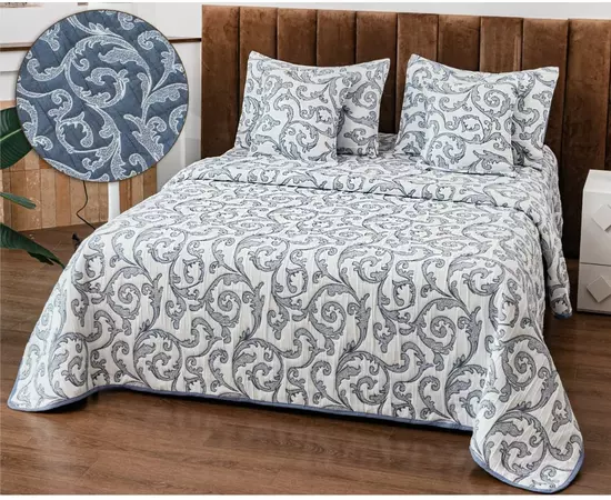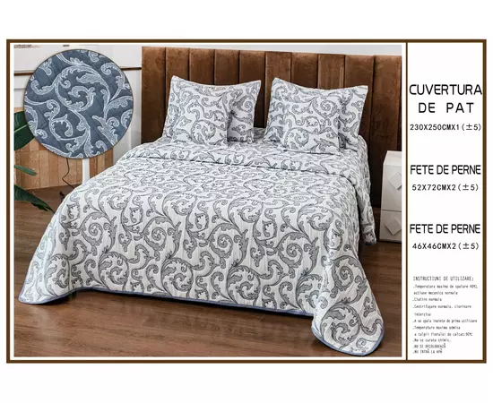 Cuvertura de pat matlasata, confectionata din bumbac tip tesatura finet.Imprimeul acestui set (cuvertura pat plus fete de perna) este realizat cu cele mai noi tehnologii - garantat nu se decoloreaza daca se respecta instructiunile de intretinere.
