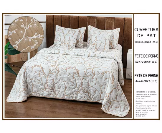Cuvertura de pat matlasata, confectionata din bumbac tip tesatura finet.Imprimeul acestui set (cuvertura pat plus fete de perna) este realizat cu cele mai noi tehnologii - garantat nu se decoloreaza daca se respecta instructiunile de intretinere.