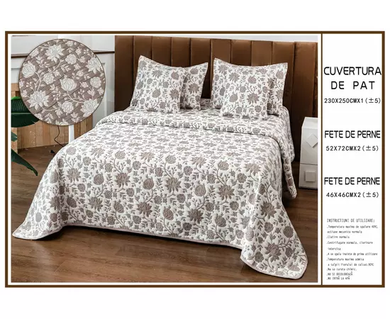 Cuvertura de pat matlasata, confectionata din bumbac tip tesatura finet.Imprimeul acestui set (cuvertura pat plus fete de perna) este realizat cu cele mai noi tehnologii - garantat nu se decoloreaza daca se respecta instructiunile de intretinere.