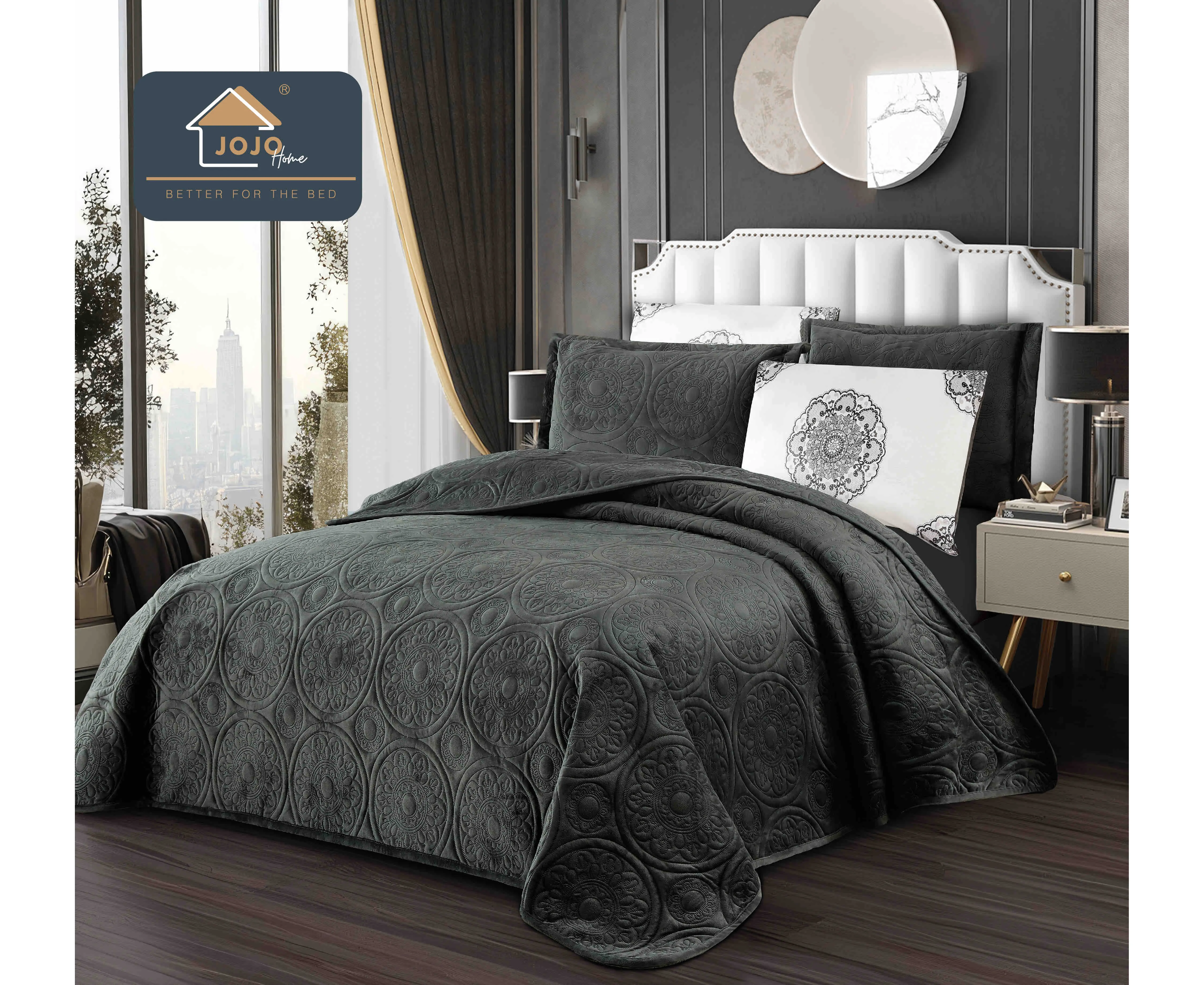 Set Cuvertura Pat Catifea, Model Relief Circular, 220x240cm, Gri Inchis - JOJ822