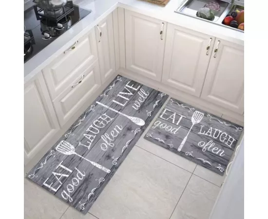 Set de covoare de bucatarie compus din 2 piese, ideale pentru orice tip de pardoseala. Confectionate din poliester, cu o suprafata antiderapanta si cu print digital de inalta calitate, aceste covoare de bucatarie vor schimba radical designul spatiului in care gatiti sau serviti masa. Protejeaza pardoseala, ofera un plus de caldura in timpul iernii si sunt foarte usor de intretinut, acestea putandu-se curata la masina de spalat.