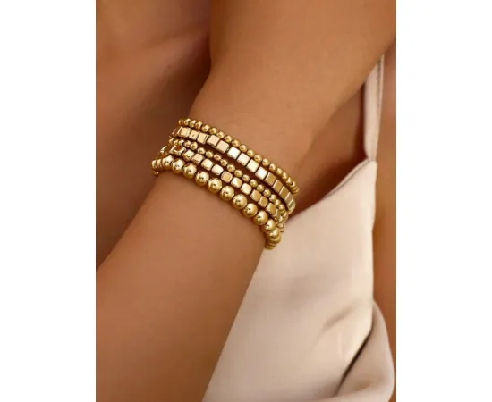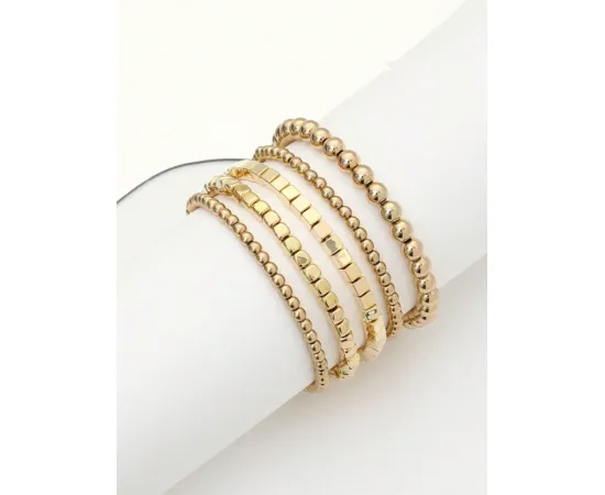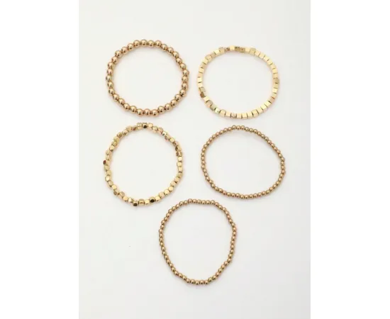 Brățările elegante aurii în set de 5 piese sunt accesorii de bijuterie ce emană rafinament și stil. Fiecare brățară este o piesă distinctivă, dar împreună formează o combinație armonioasă și sofisticată.