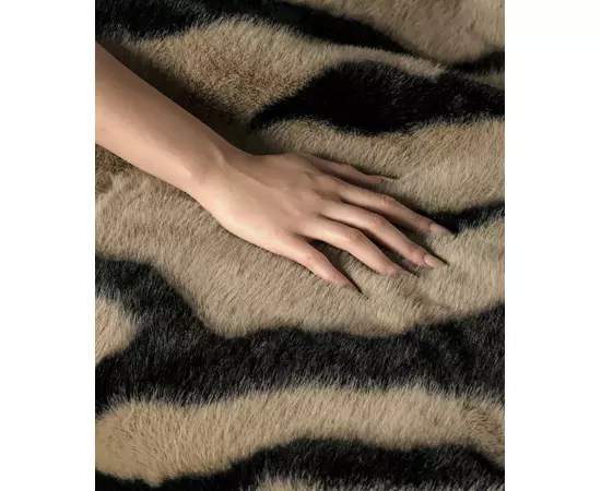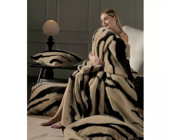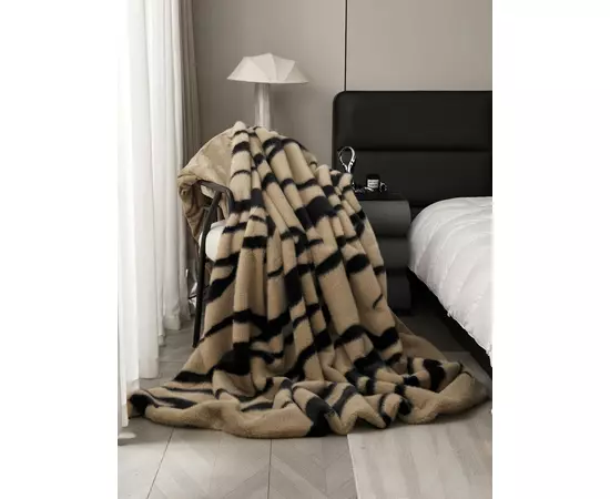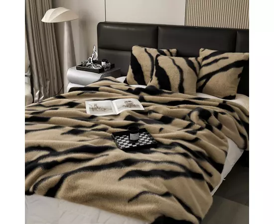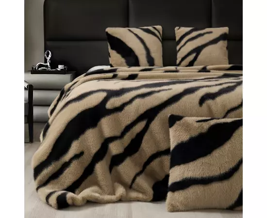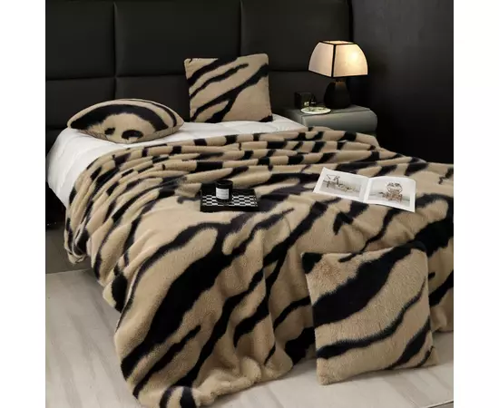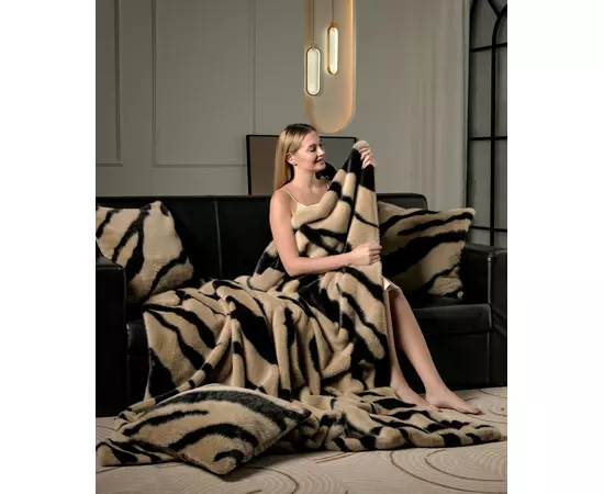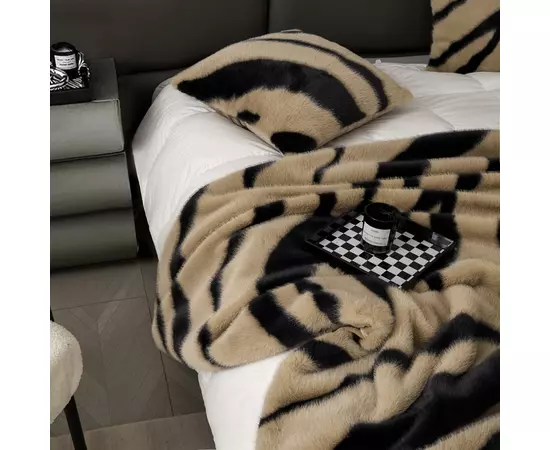 Set de Lux Din Blana Artificiala de Nurca, Cu Fermoar, Hipoalergenic, Patura + 2 Fete de Perna, Bej/Negru - JOJ703
