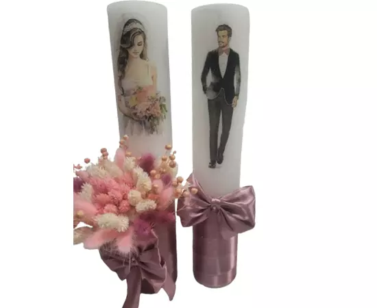 Fiecare lumanare din acest set este împodobită cu flori stabilizate, care sunt flori naturale tratate special pentru a păstra frumusețea lor și a rezista în timp fără a se ofili. Aceste flori stabile oferă o eleganță subtilă și o notă romantică, perfectă pentru atmosfera unei nunți.