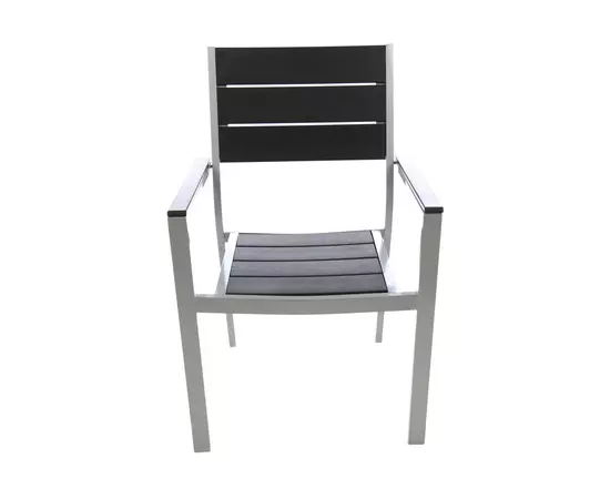 Scaunul are scheletul fabricat din aluminiu acoperit cu o pelicula fina de vopsea gri. Sezutul si spatarul sunt confectionate din material plastic rezistent, ce imita perfect sipcile de lemn. Dimensiuni: 57 x 55 x 89 cm.