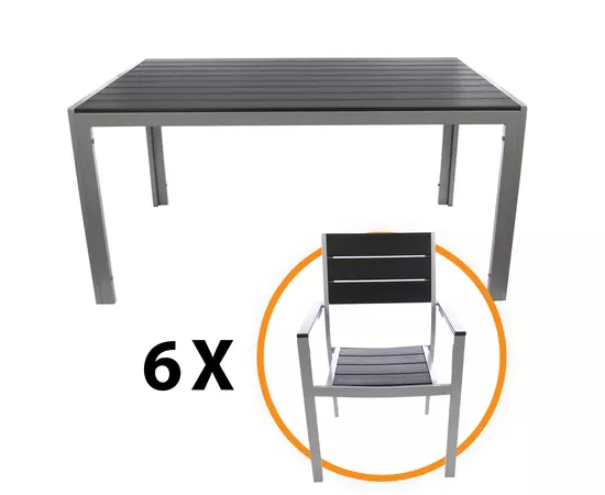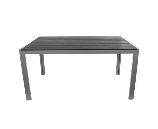 Structura mesei este fabricata din aluminiu, iar blatul din material plastic, ce imita foarte bine sipcile din lemn. Blatul mesei are forma dreptunghiulara cu lungimea 150 cm si latimea 90 cm.