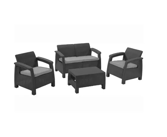 Pentru un plus de confort, canapeaua si scaunele sunt prevazute cu brate si se livreaza cu perne din poliester. Prin designul simplu dar elegant si culoarea versatila acest set va oferi un plus de rafinament si confort gradinii sau terasei dumneavoastra.