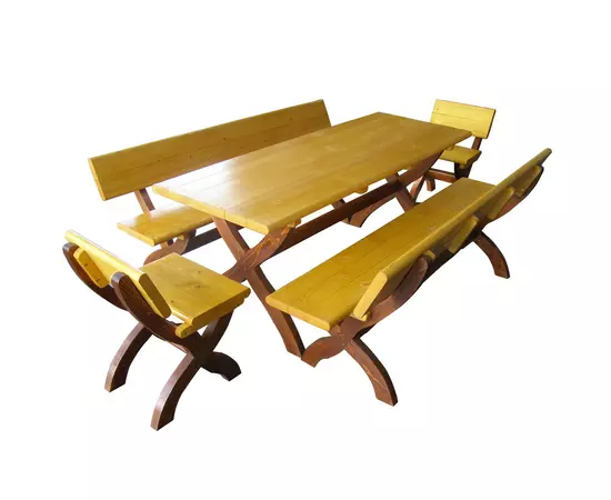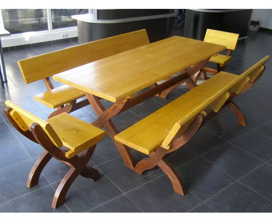 Produsul este confectionat din lemn masiv cu inalt grad de finisare. Suprafata lemnoasa este tratata cu bait si lac pe baza de apa. Are o capacitate de 10 persoane.