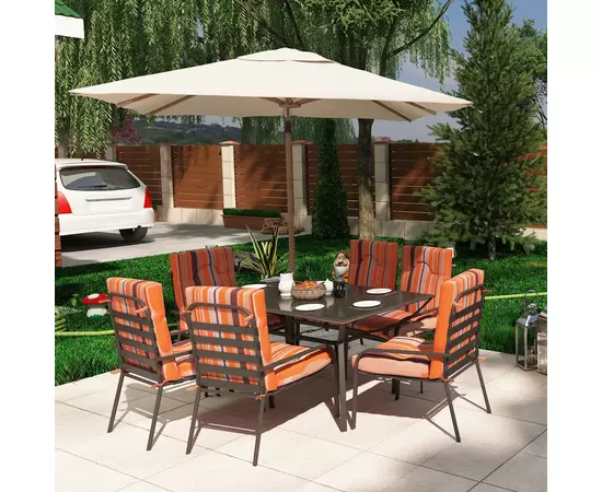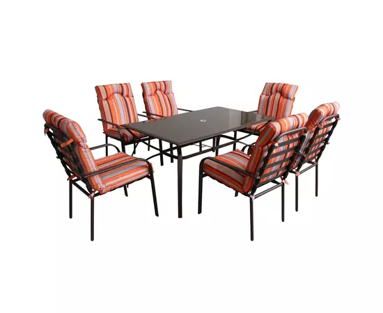 Setul contine o masa dreptunghiulara cu orificiu pentru umbrela si sase scaune fixe cu spatar inalt si brate rotunjite. Pentru un confort ridicat, scaunele au incluse perne care acopera atat sezutul cat si spatarul.