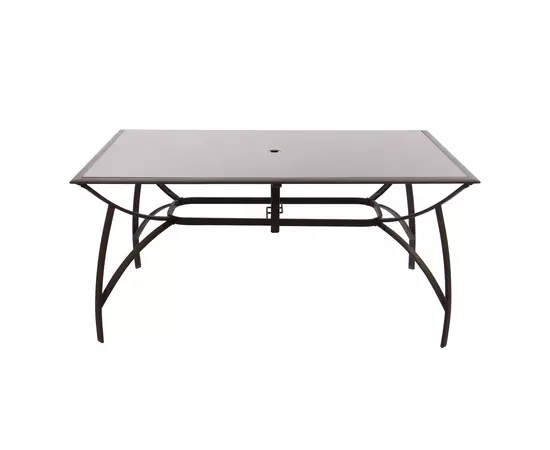 Masa are structura din otel, dimensiunea de 150 x 90 x 72 cm si se livreaza insotita de un blat de sticla tratata termic de 5 mm grosime, de culoare maro inchis. Scaunele sunt fabricate din otel iar pernele sunt din poliester cu o grosime de 5 cm.