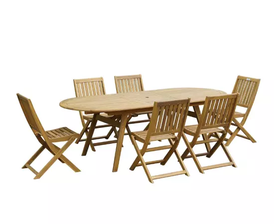 Setul de mobilier pentru gradina contine o masa ovala si sase scaune pliante cu spatar. Suplimentar, se poate atasa si o umbrela intrucat masa este prevazuta cu orificiu pentru umbrela.