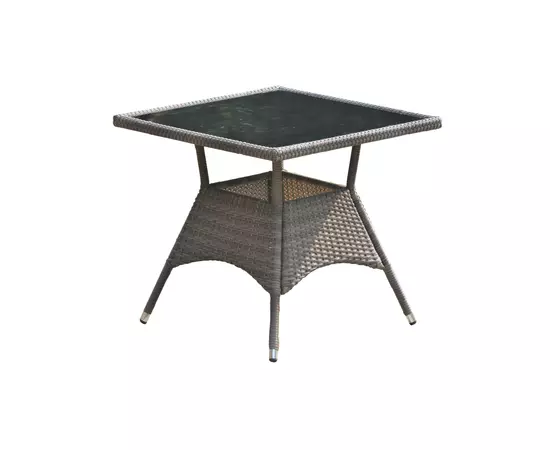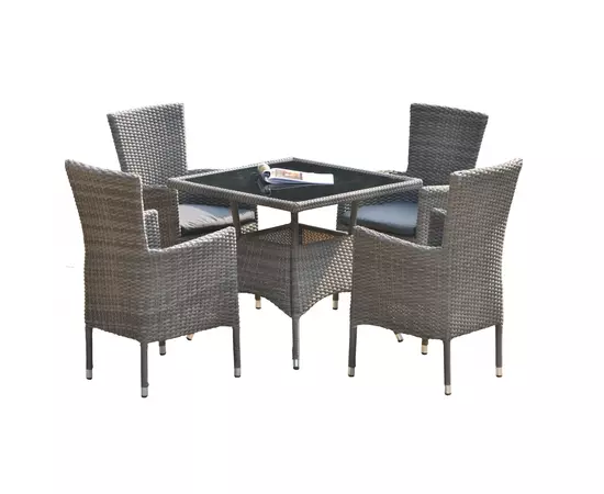 Masa are structura din aluminiu si se livreaza insotita de un blat de sticla de 5 mm grosime. Scaunele sunt fabricate din tub de aluminiu acoperit cu impletitura de ratan sintetic si au incluse perne de 4 cm grosime, din poliester, pentru un plus de confort.