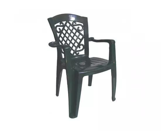 Scaunul este confectionat din material plastic, verde, cu dimensiunile: 46 x 55 x 90 cm, iar pentru o mai buna relaxare este prevazut cu spatar si brate laterale.