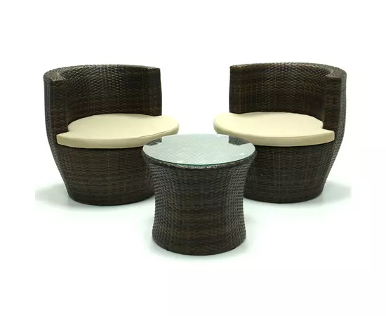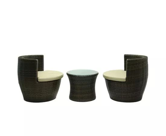 Setul contine doua fotolii fixe si o masa rotunda fixa care se livreaza impreuna cu un blat de sticla tratata termic de 5 mm grosime. Pentru un plus de confort fotoliile au fost concepute cu spatarul rotunjit si au incluse perne cu grosimea de 5 cm.