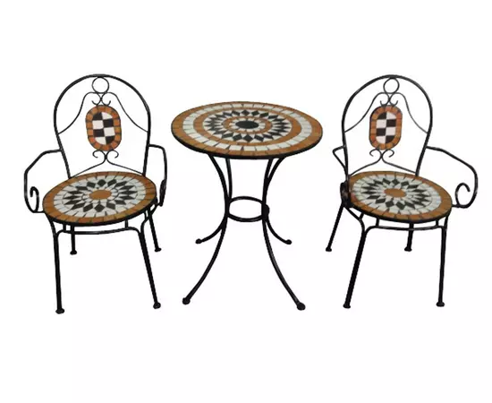 Setul contine o masa rotunda si doua scaune cu spatar, fixe, cu structura fabricata din otel acoperit cu o pelicula de vopsea completat de bucatele de mozaic cu motiv geometric.