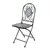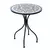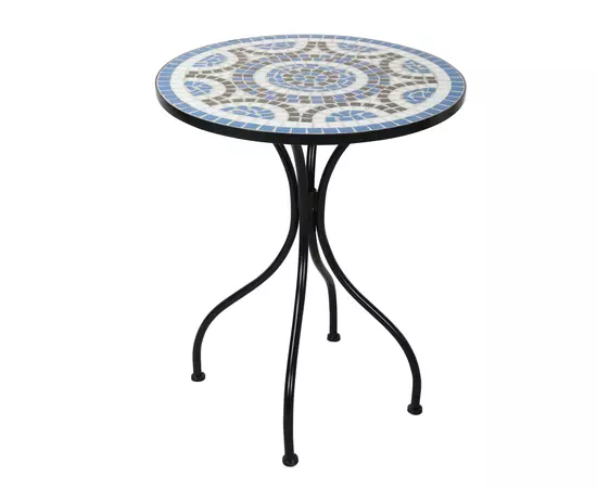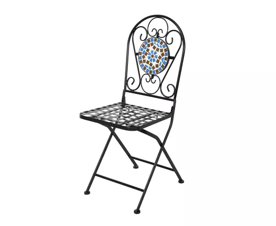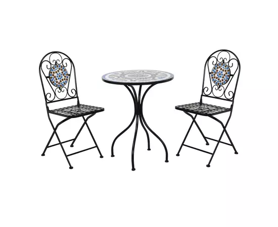 Setul contine o masa rotunda si doua scaune cu spatar, pliante, cu structura fabricata din otel acoperit cu o pelicula de vopsea completat de bucatele de mozaic cu motiv geometric.