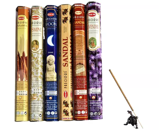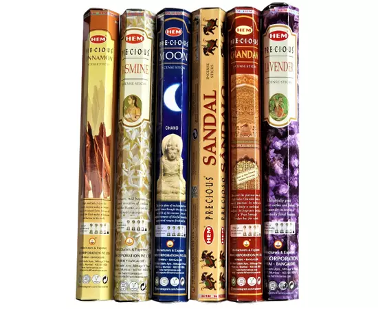 Setul mixt 120 betisoare parfumate HEM ([Precious Cinnamon, Precious Jasmine, Precious Moon, Precious Sandal, Precious Chandan, Precious Lavander) contine 6 arome a cate 20 betisoare parfumate fiecare. Betisoarele sunt fabricate in India.